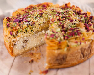 Cream cheese, honey, walnuts, pistachios, phyllo, butter, brown sugar, spices.