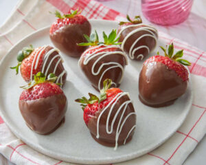 Fresh strawberries dipped in dark, milk, or white chocolate.
