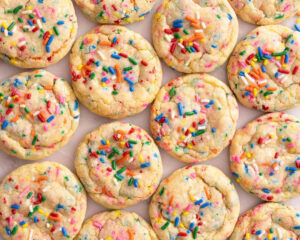 Flour, butter, brown sugar, vanilla, sprinkles, eggs.